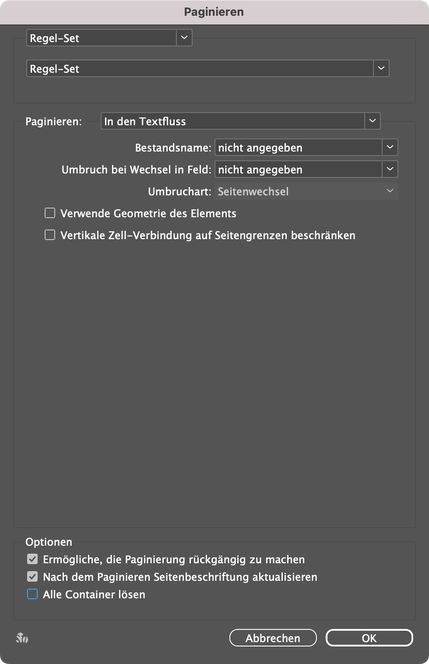 Eine weitere Anwendung des Paginierungsmodul ist das Einstellen von Paginierungsregeln für InDesign-Rahmen und InDesign-Gruppen. Typische Anwendungen sind: