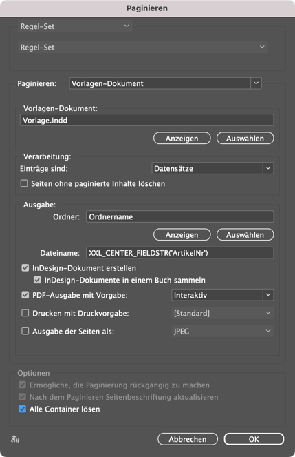 Mit dieser Methode können Sie ein InDesign Vorlagen-Dokument, das Platzhalter (Feldspezifikatoren) enthält, mit einem bzw. mehreren Datensätzen füllen lassen. Anschließend wird das Dokument als InDesign- und/oder PDF-Dokument ausgegeben. Die typische Anwendung dieser Paginierungsmethode ist die Erstellung von Datenblättern oder sonstigen Print-Produkten, bei denen ein Dokument pro Datensatz bzw. Datensatzgruppe erstellt werden soll.